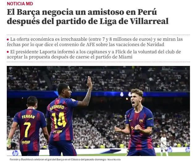 来自《世界体育报》最新消息,巴萨俱乐部计划在圣诞节前飞赴秘鲁,进行一场商业性质的表演赛,出场费高达700万到800万欧元。这笔钱对于现在的巴萨来说,简直就是雪中送炭。